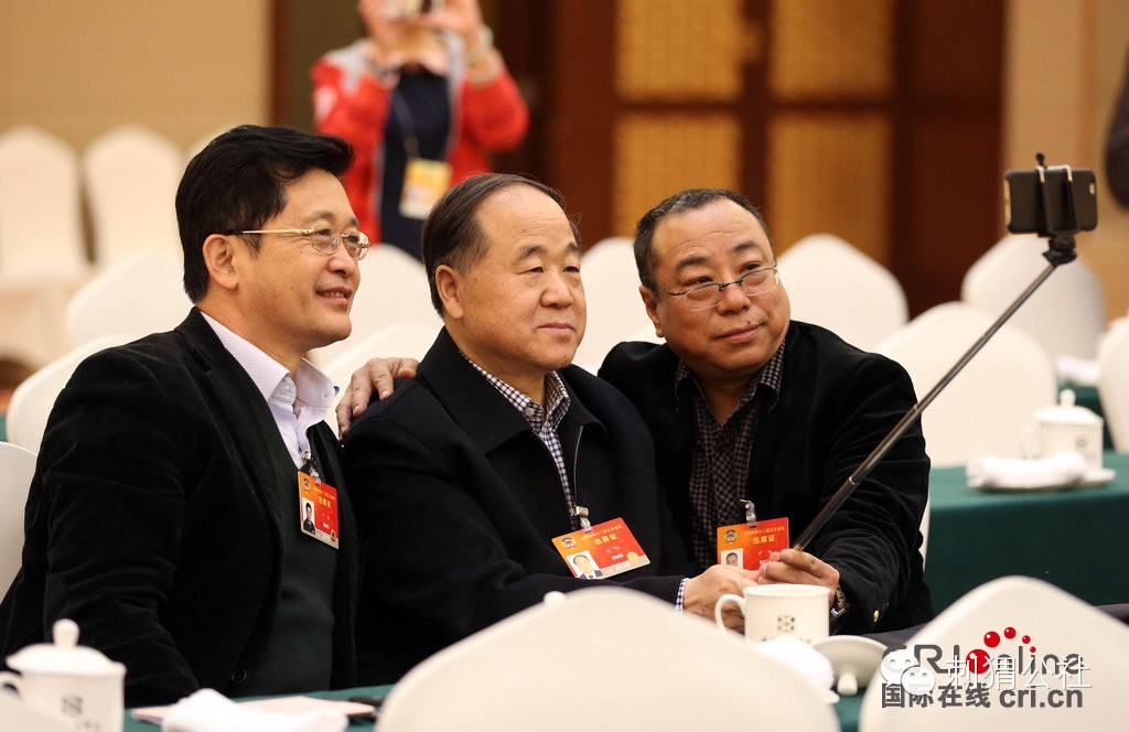 5、2015年03月07日,在政协文艺组联组会前,莫言与参会委员开心玩自拍露灿烂笑容。