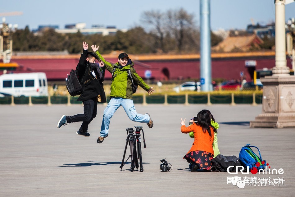 8、2015年3月9日,政协全体会议之前,媒体记者在天安门广场跳跃留影。