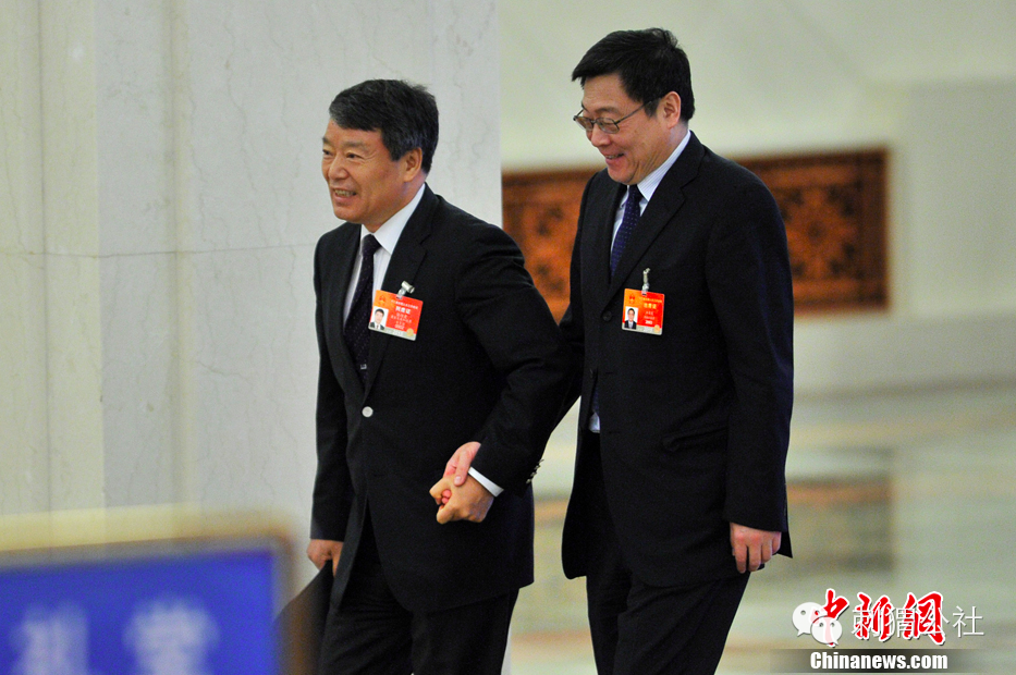 28、2015年3月8日,十二届全国人大三次会议第二次全体会议在人民大会堂举行,国家发改委主任徐绍史(中)和环保部部长陈吉宁(右一)齐步走进入会场。