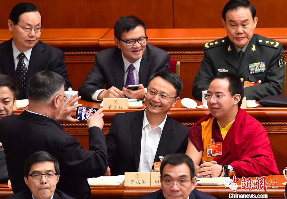 24、2015年3月10日上午,全国政协十二届三次会议在人民大会堂举行第三次全体会议,多名政协委员就有关议题作大会发言。十一世班禅额尔德尼·确吉杰布与参会委员合影。