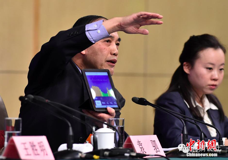 26、2015年3月10日下午,十二届全国人大三次会议新闻中心在梅地亚举行记者会,全国人大环境与资源保护委员会副主任委员袁驷正在举着平板电脑回答记者提问。