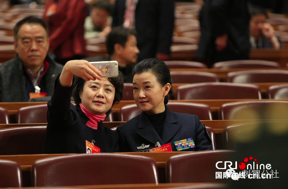 15、3月3日,全国政协十二届三次会议开幕式在人民大会堂举行。委员进入会场后,纷纷拿出手机相机拍照留念。图为宋祖英委员与李胜素委员用会前间隙自拍。