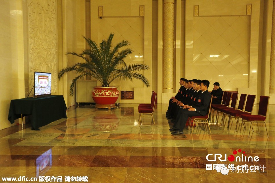 9、2015年3月9日,北京人民大会堂内,黑衣安保人员笔直坐在位子上,看电视直播会议内容。
