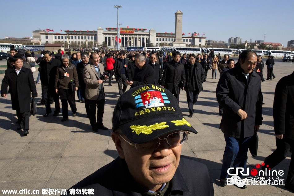 6、2015年3月9日,北京天安门广场上,有一政协委员戴着帽子很醒目,帽子上刺绣“CHINA NAVY 中国海军南沙卫士”花样图案。