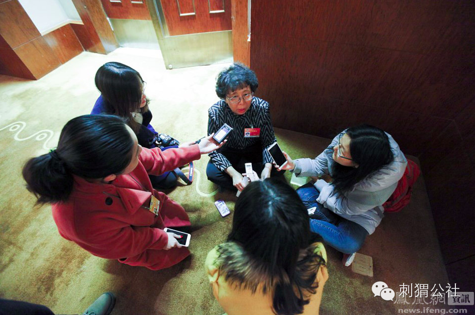 12、2015年03月05日,全国政协十二届三次会议举行小组讨论,在妇联界别会议室外,政协委员尚绍华与记者席地而坐,回答记者提问。今年尚绍华委员提交了关于反家暴法的以暴制暴案件审理以及多机构合作机制两个提案。