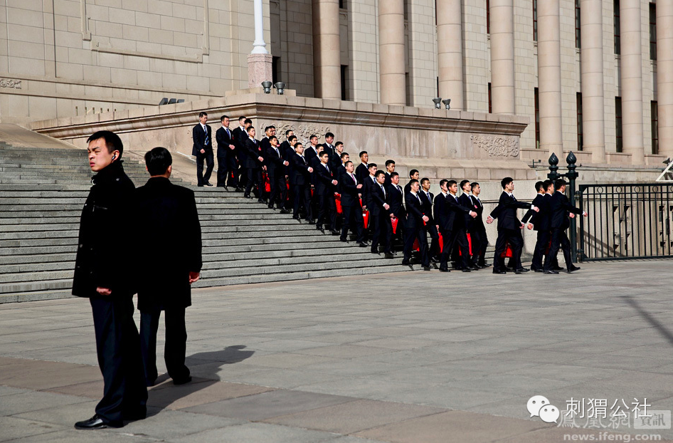 16、3月4日,十二届全国人大三次会议在北京人民大会堂举行新闻发布会。图为人大发布会期间,人民大会堂门口一群黑衣安保人员换班轮岗。