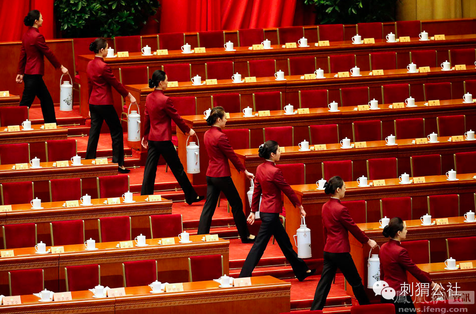2、孙娜是一名两会中的会场服务员,在十二届全国人大三次会议中,贵州代表团及四川代表团的人大代表入驻国谊宾馆,让她的工作格外忙碌,每天要工作17个小时左右。服务好一场会议,对于孙娜来说就像一场紧张的战役。图为下午三点会议开始,孙娜和同事们每半小时要提供一次上水服务,每次上水需要十分钟左右,要求服务标准,亲切、准确。