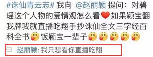 而所谓的大尺度的想看直播吃翔,也是因为提问的粉丝说道如果被赵丽颖翻牌就直播吃翔。所以,才有了后面赵丽颖的…….