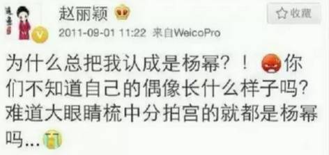 刚出道的时候,她就因为有人把她认成了“杨幂“,在微博上发过牢骚: