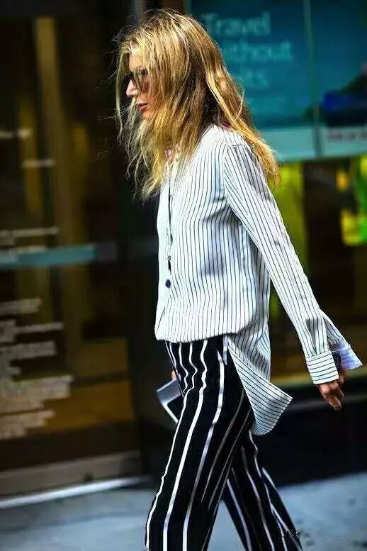 条纹裤的好处不用多说,显长显瘦显直。各种修饰曲线的作用,但切记要选择颜色分明的条纹