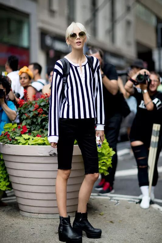 比例夸张的条纹或是色彩冲击强的条纹,都是吸引人的不错单品,黑色和冷白色的条纹,有一种酷酷的性冷淡风,搭配中短裤,更是帅出天际。