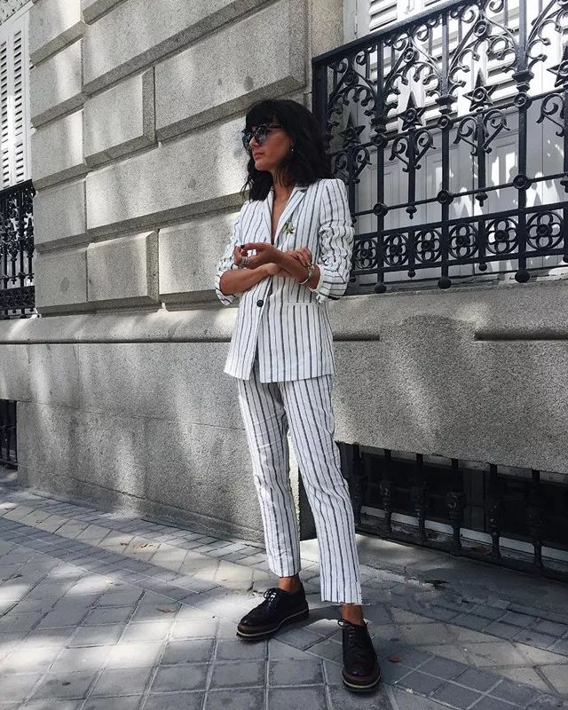 也可以是完全相同的条纹西装~营造职场干练大女人的气质~