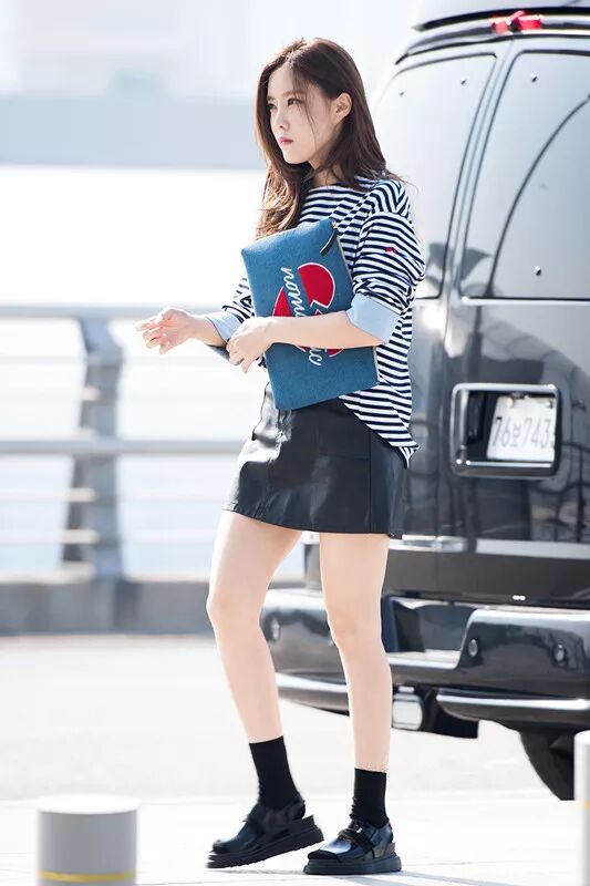 朴孝敏的这件条纹就略显密集了,这样的条纹上衣一定不能松散的全部放在下装的外面,那样会让你看起来像个中学生。像朴孝敏这样不规则的扎在短裙里,显的随性又自在。