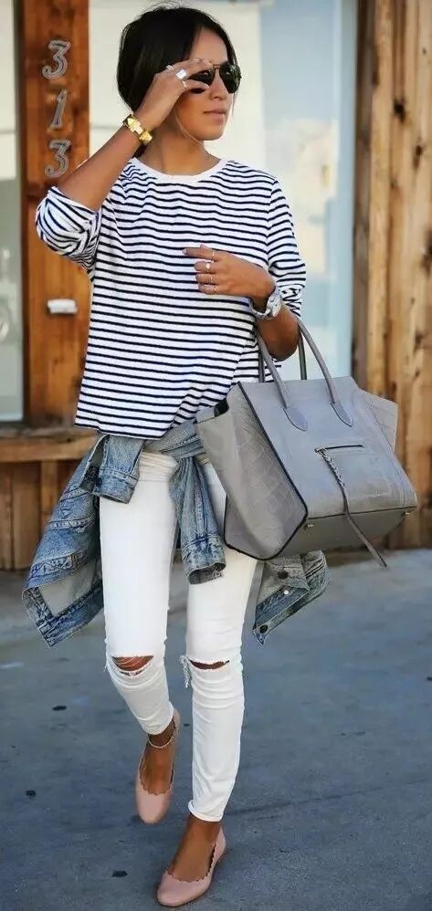 一件彩色条纹的上衣,搭配一条复古的水洗牛仔裤,就是一套很好的出街look 了