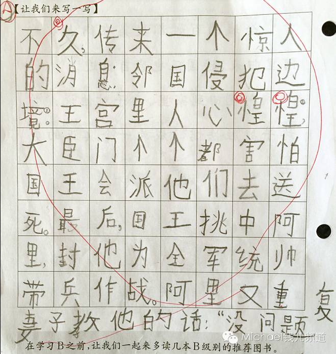 这是他上周写的语文作业,小学一年级,字写成这样,我觉得已经算不错了。书写很流畅,卷面也足够干净。