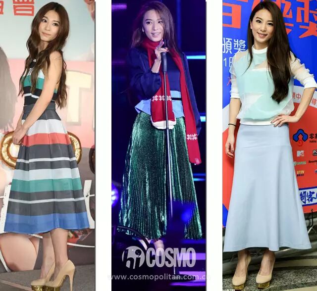 以往在SHE团体里面,场合穿扮都讲求3人的整体性,因此没有体现太多的个人特色。脱离了S.H.E束缚的Hebe,便开始走自己的个性穿衣路线,中长裙穿出田馥甄腰细腿长的好身材。