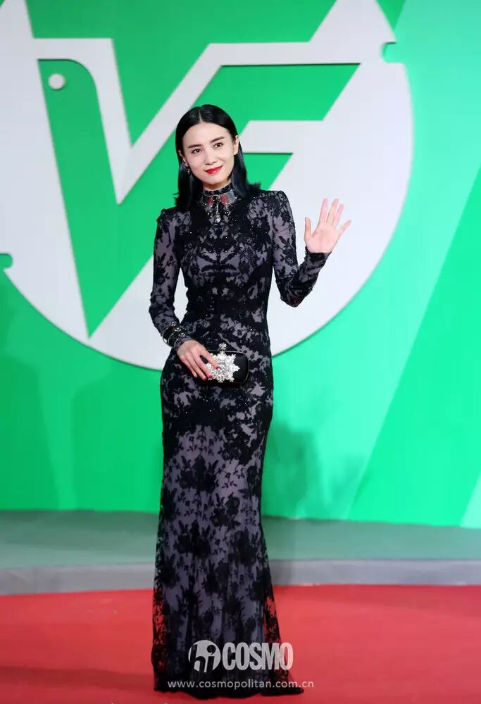 出席红毯,宋佳的黑色蕾丝裹身长裙性感妩媚,利落的发型搭配红唇,气场强大。