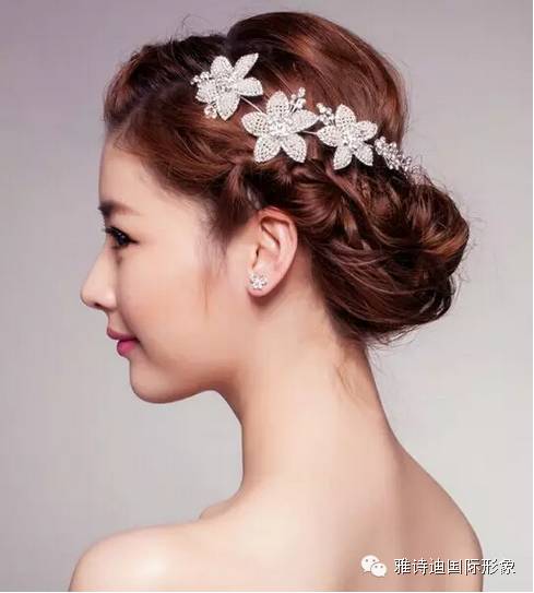 发型六:低低往后挽起的刘海从后面也松松挽起来,采用麻花辫盘起来形成一个花苞,只需要一只耳环相配,从侧来看已是很优雅,高贵又时尚。