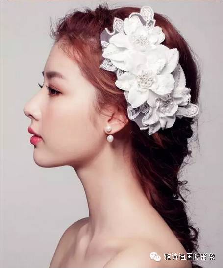 发型四:把刘海往上拨起,形成一个优雅的发拱,在头顶处也形成一个发拱,在这个发拱处再佩戴一个花装饰,而其他头发也简单地别到后面,不需要过多首饰,也让新娘子变得很优雅。