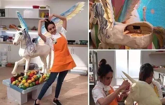 就连做蛋糕也要玩大的,把人生过得风生水起,还和团队一起制作了一个超大的翻糖蛋糕“独角兽”,这个比Jolin还高的独角兽,象征着勇敢飞翔,活出缤纷人生,这大概就是她想传达的蛋糕哲学。