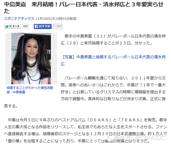 【星闻】中岛美嘉结婚 东瀛音悦Tai 日韩女星 2014-11-26 18:38:23 651 创作不易,用心坚持,欢迎请BaGua喝几杯爱心咖啡!打赏并支持本文 打赏并删除本文 中岛美嘉结婚!中岛美嘉将与日本排球选手清水邦広结婚!并于下月圣诞节的时候提交结婚登记申请表。男方28岁,身高1米92。俩人在观看排球比赛时相识,2011年的夏天开始交往。中岛美嘉于11月5日时隔9年发行了精选专辑,作为歌手的她将开启新的人生。让我们来一起祝她幸福吧! 创作不易,用心坚持,欢迎请BaGua喝几杯爱心咖啡!打赏并支持本文 打赏并删除本文 感谢您的支持鼓励,我会继续努力的!文章地址:用户邮箱:打赏金额:USDT 请输入数字点击”去打赏“,即可进行打赏支持本文章哦 About the Author 东瀛音悦Tai 功能介绍:音悦Tai日本音乐频道 官方认证:北京宽客网络技术有限公司 Related Posts 坂口宪二无期限休止艺能活动,《医龙》第五季怕是盼不来了吧. 2018-04-02 17:06:16 【MUSIC STATION ウルトラFES 2017】演唱曲目公开! 2017-09-15 17:46:19 【长瀬智也*神谷浩史】天呐,次元壁又裂了! 2017-07-04 17:55:44 【稻垣吾郎、草剪刚、香取慎吾】合约期过后退出杰尼斯事务所! 2017-06-19 17:25:06 【相叶雅纪】侦探大人,可否一起喝杯红茶~ 2017-03-17 17:55:13 发表评论