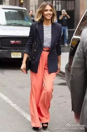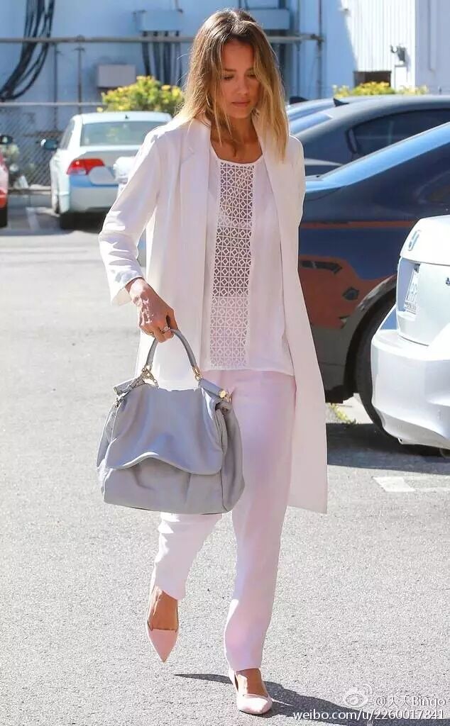 从去年开始流行white on white,请大伙也都入手一件白色西装吧!白色西装当然有人会担心显胖。看看Jessica Alba怎么穿你的应该明白了,永远不系纽扣。