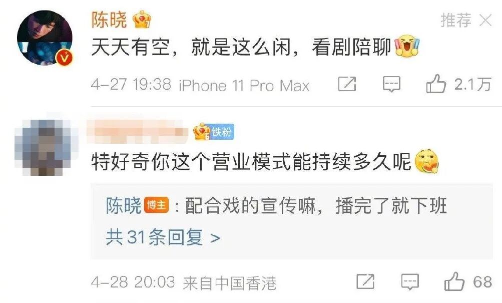 虽然每当有剧集播出时,陈晓都会上线营业,但对于他来说,这也只是“配合剧的宣传嘛,(剧)播完了就下班”。