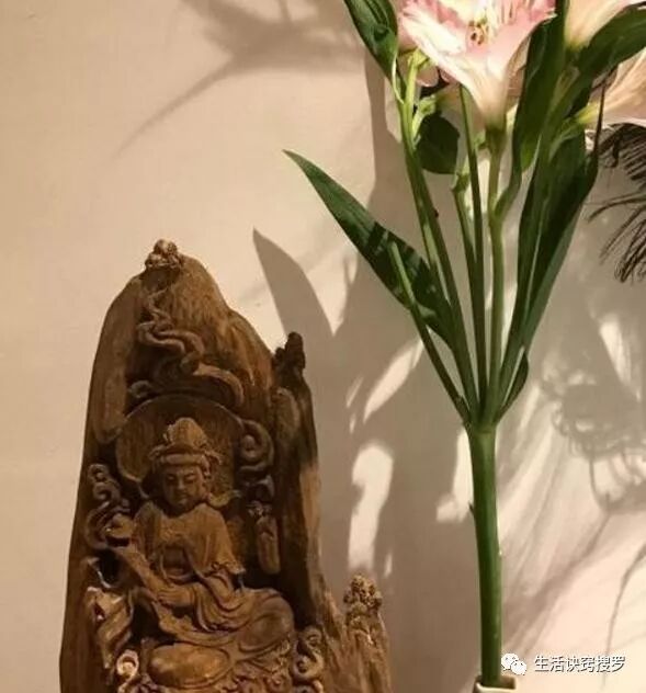 家里摆放着一个观音木雕,为了让整个木雕显得更加生动自然,她在木雕的旁边摆放上一个细口的花瓶,插这一支花。可惜,如果是柳条就更加有意境了。