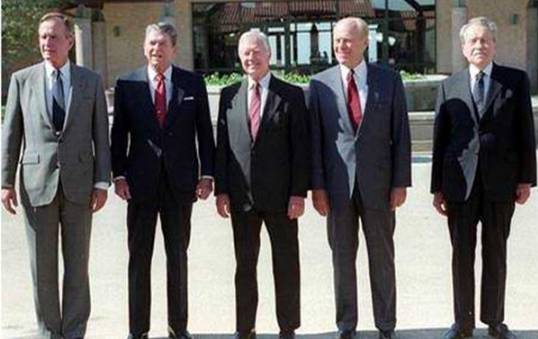历史老照片:美国总统们的合照,他们是尼克松、老布什、卡特、福特、里根。