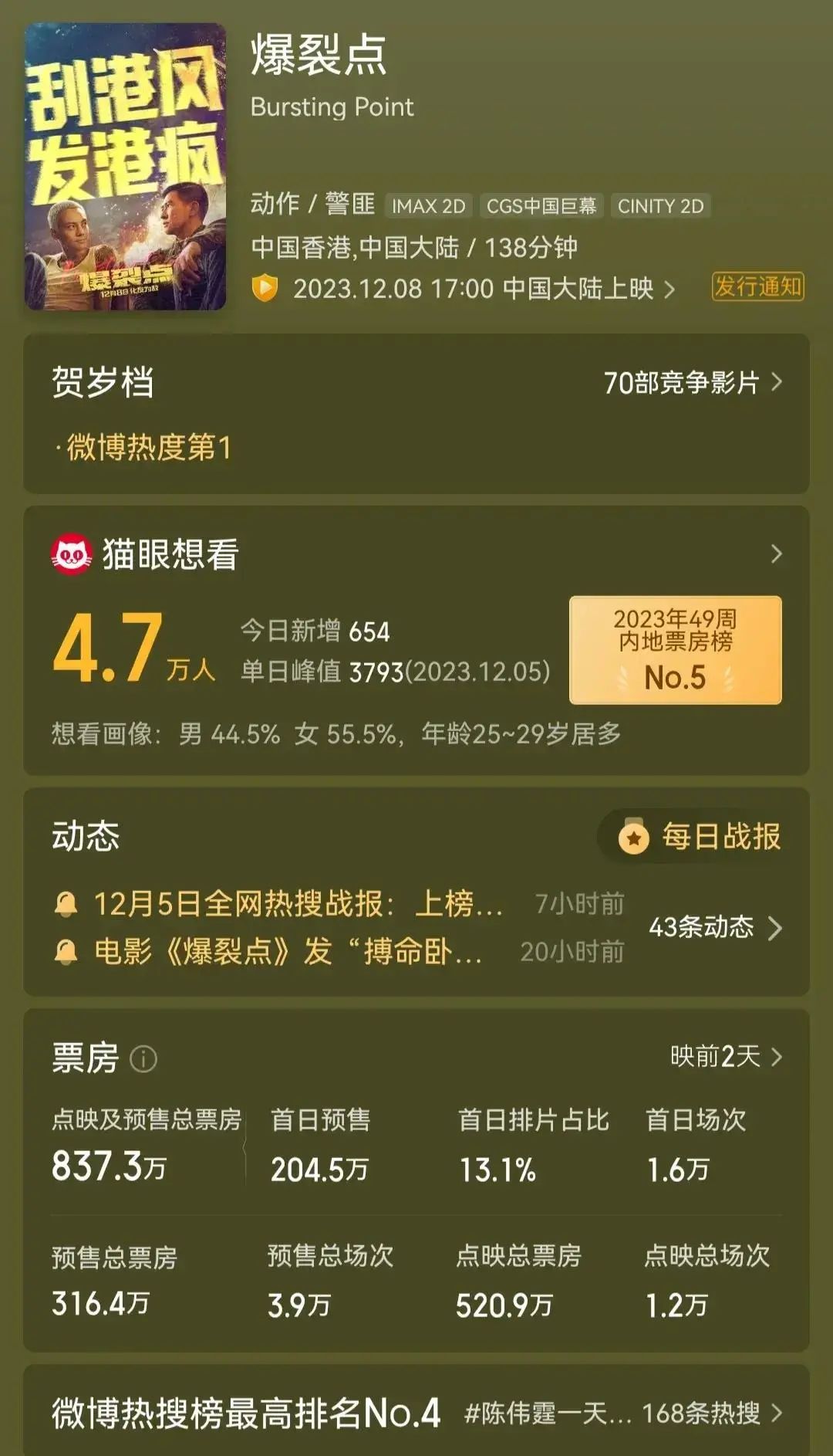 张家辉电影《爆裂点》点映票房已经达到500万+,距离上映还有两天,预测票房将会突破15亿,港片复兴重现往日荣光。