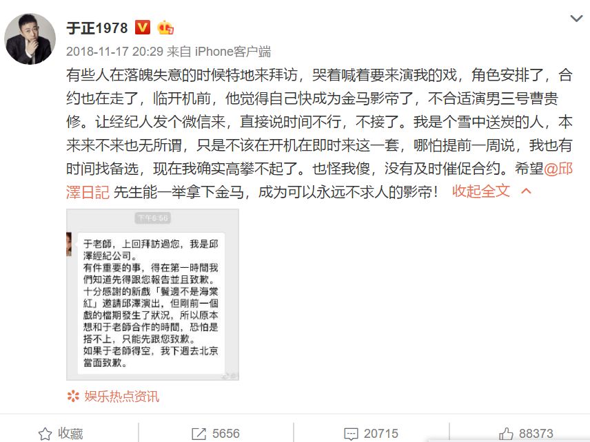 去年金马奖颁奖前夕,于正在微博吐槽邱泽临时辞演,“有些人在落魄失意的时候特地来拜访,哭着喊着要来演我的戏……”