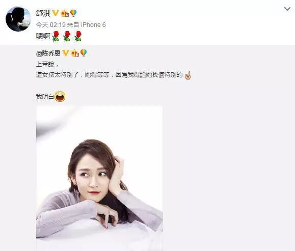 陈乔恩在微博晒出一张自己的美照,并附文称“上帝说,这女孩太特別了,她得等等,因为我得给她找个特别的,我明白”,疑在回应网友频频催嫁的关心,并表明自己是因为够特别上天才让她多等待,直到找到最适合她的白马王子。也许是因为作为同被“催嫁”的一批演艺圈“大龄剩女”,舒淇似乎对此也感同身受,转发该文并附文“嗯啊”。