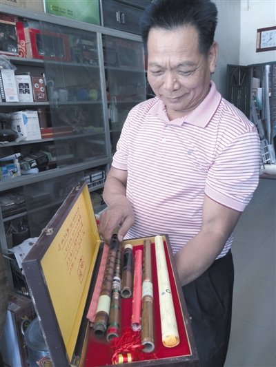 陈合池自豪地展示家里的乐器。 本报记者 邓金培 摄