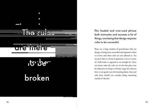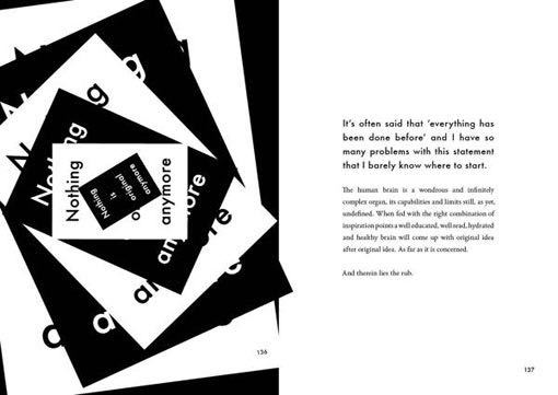 “我写明了我的目的,寄发邮件给许多设计朋友和设计大师们,请他们写一个在他们设计生涯里要突破的老套;我其实也没料到几乎所有的人,包括大设计师米尔顿‧格拉泽(Milton Glaser,设计了著名的I ♥ NY 与LOVE 作品)、设计界的革命家戴维‧卡森(David Carson)等人都回信分享他们在设计界学到的功课,这让我很兴奋。于是,在出版前的最后一秒,我决定用这个鲜艳的颜色来分享这些人的佐证。”