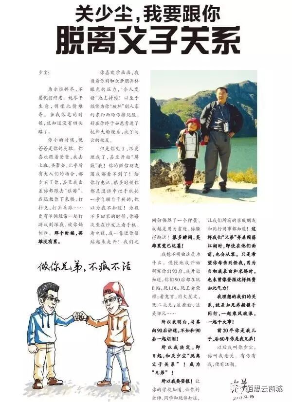 2月15日,杭州《都市快报》五版整版刊登了一则题为《关少尘,我要跟你“脱离父子关系”》的声明。准确地说,是一封父亲写给90后儿子的信:与其向90后讲道,不如和90后一起胡闹!所以我决定,即日起和关少尘“脱离父子关系”,成为“兄弟”!