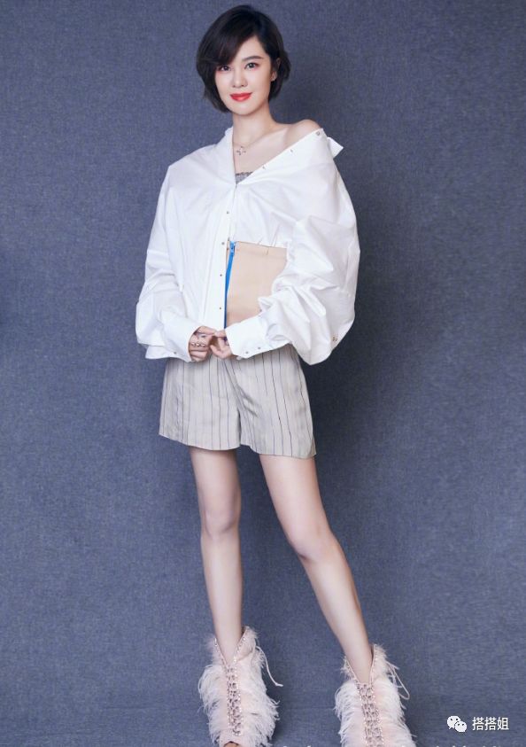简洁的白色拼接大领口衬衫搭配灰色的竖条纹宽松短裤,脚踩裸粉色的,毛毛鱼嘴高跟鞋,青春甜美。