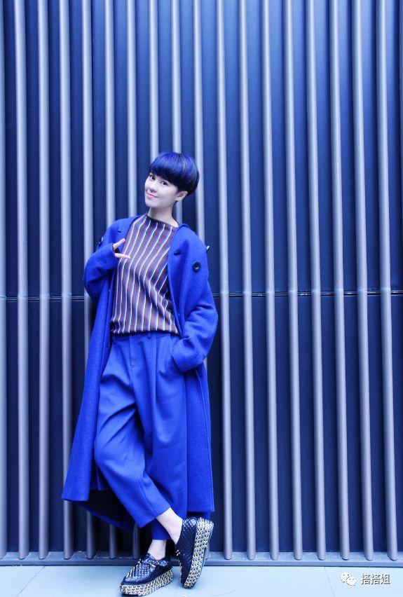 黑色竖条纹的休闲打底衫搭配宝蓝色的阔腿裤外搭宝蓝色的休闲过膝长大衣,脚踩厚底鞋,帅气干练、