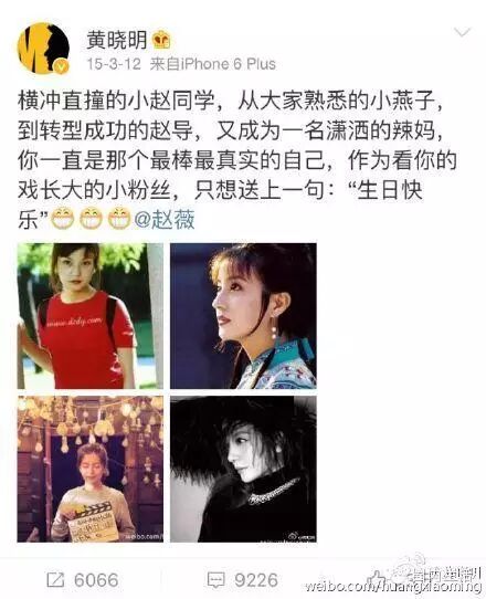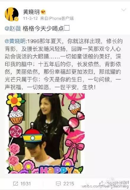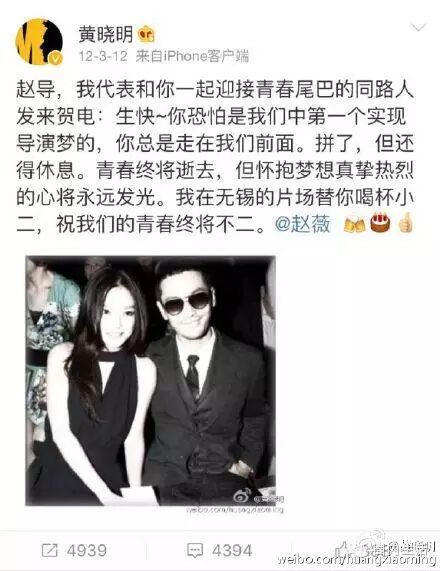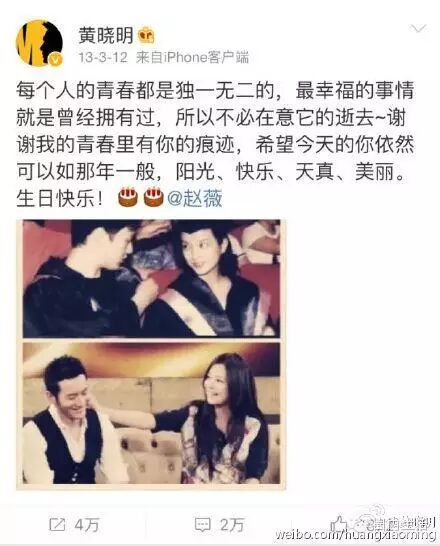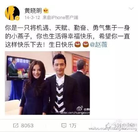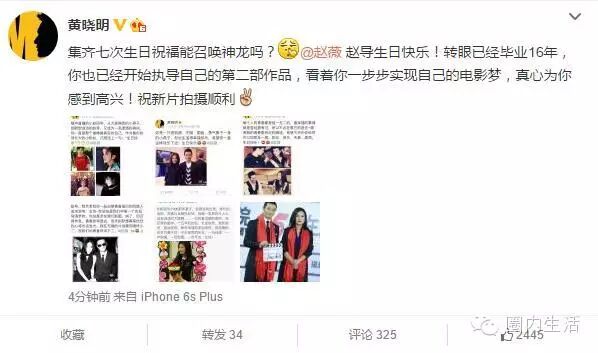 黄晓明微博 “ 集齐七次生日祝福能召唤神龙吗?@赵薇 赵导生日快乐!转眼已经毕业16年,你也已经开始执导自己的第二部作品,看着你一步步实现自己的电影梦,真心为你感到高兴!祝新片拍摄顺利 ”而黄晓明也有心的晒出之前的生日祝福,让网友直呼暖心