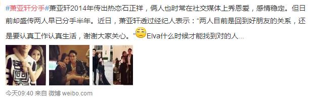 萧亚轩经纪人公开回应,萧亚轩已经和男友石正祥(Elroy)分手,回归好朋友的身份。