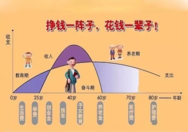 我们可以从人生收入支出的草帽图来看,随着年龄增长,40~55岁虽然是收入顶峰时期,但同时也可以看到,这个时期也是人生责任最大的时期: