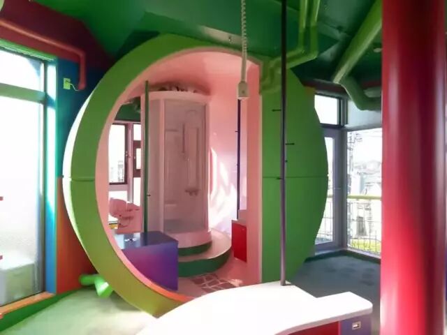 房子里地是不平的(特意设计出符合脚窝的弧度),大部分东西都是悬挂起来的,厨房不在边上而在客厅中心。各种违反常识的设计,充满探索乐趣,来这里真的是把常识都反转了。