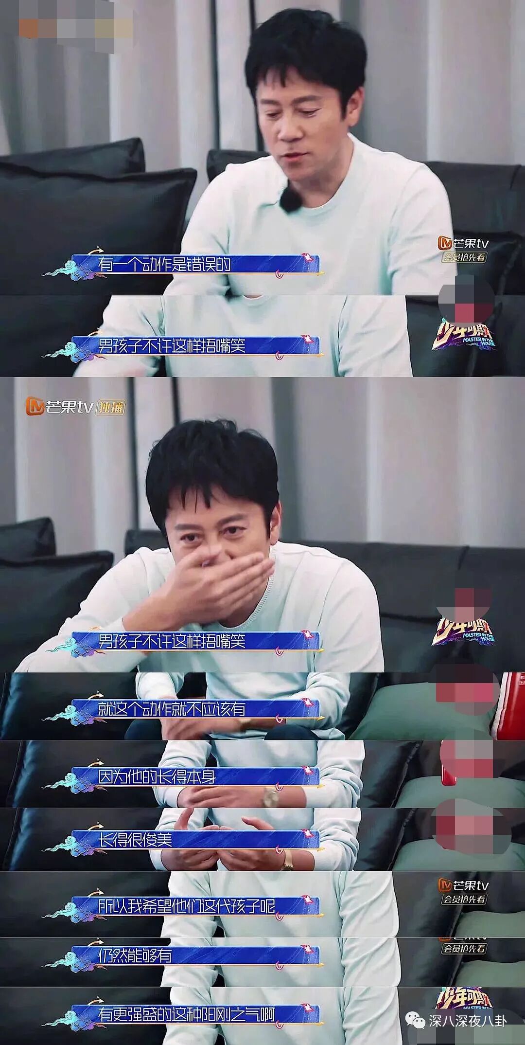 换一个跟很多爱豆一起录的节目,他又开始教训朱正廷不要捂嘴笑,因为这样显得娘,显得没有“阳刚之气”。