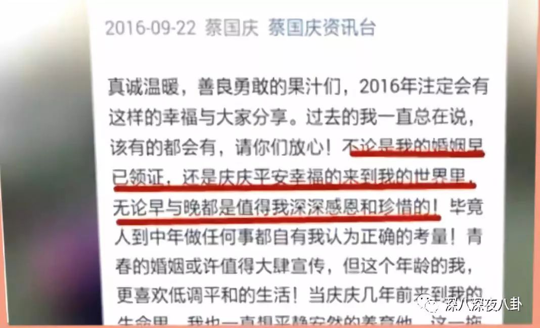 但有的时候事情就是很让人迷惑,在他跟孩子都最受争议的时候,蔡国庆发了条长文,表示自己早已领证、结婚生子,只是没跟大家说,