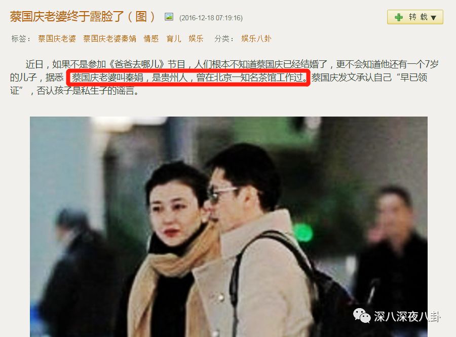 还有媒体称扒出了蔡国庆老婆的个人信息,是一位叫秦娟的贵州人,曾经在北京一个知名茶馆工作,圈外人,