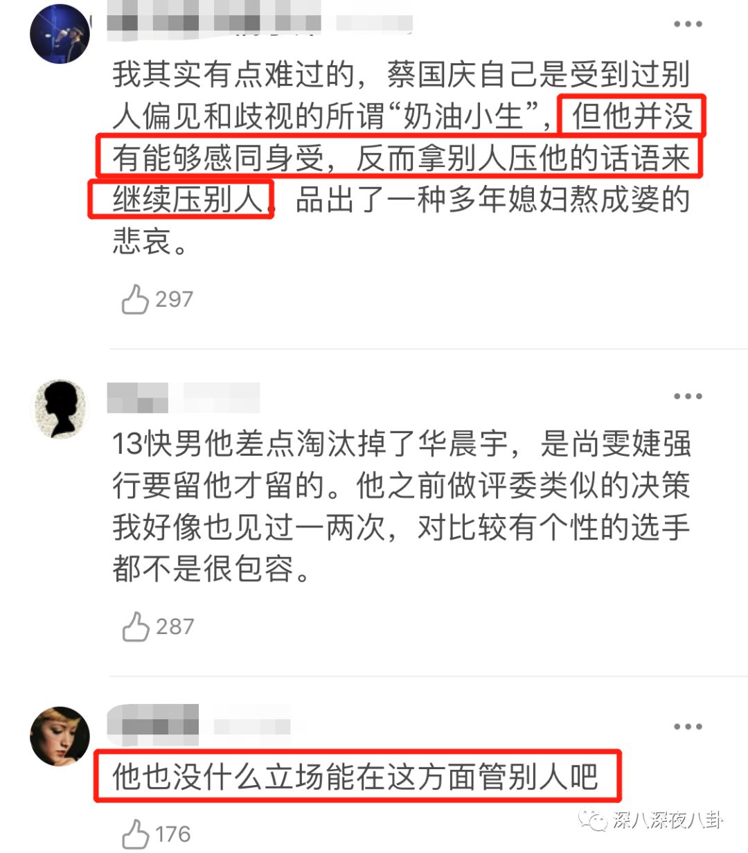 但也有很多人觉得,既然蔡老师年轻时就已经因此受到别人的攻击,那在审美包容度更高的现在,为什么不能感同身受地包容他们,反而“拿别人压他的话来继续压别人”?