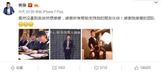 他先在今天凌晨发了条微博,表示“虽然没拿到奖依然想感谢,感谢所有帮助支持我的朋友伙伴!感谢我亲爱的团队。”
