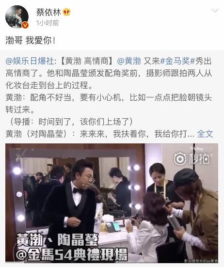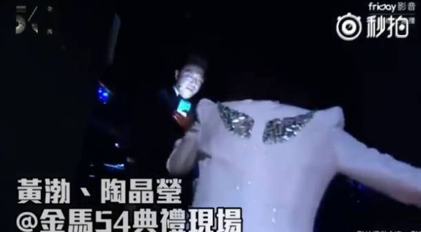 微博上流传最广的这段视频,是黄渤与陶晶莹颁发配角奖前,摄影师跟拍两人从化妆台走到台上的过程。