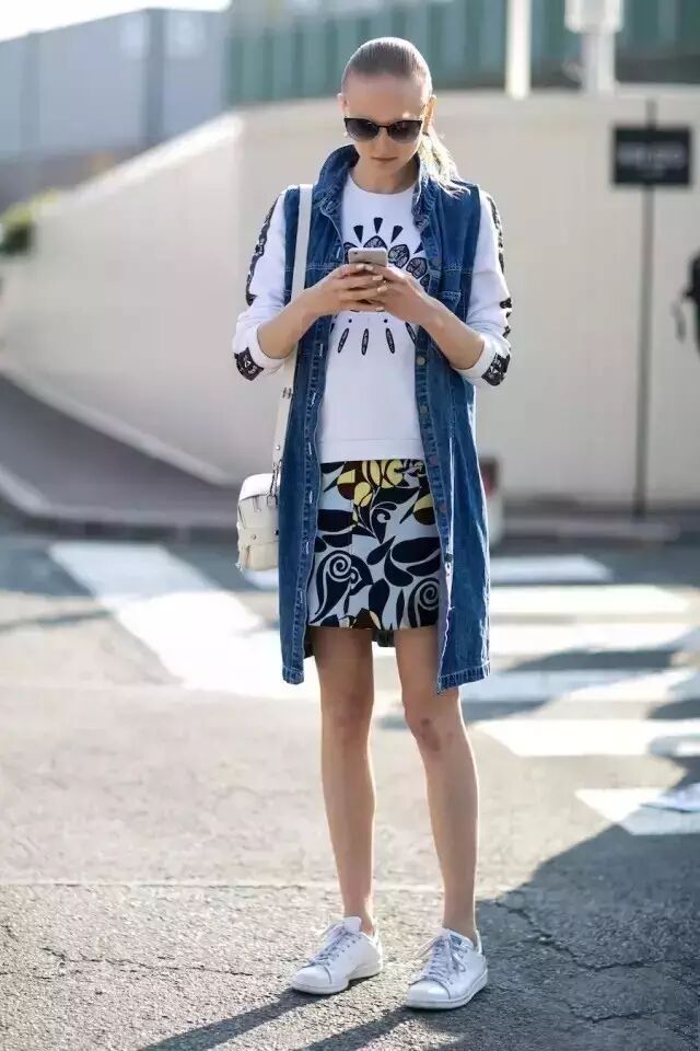 也可以搭配印花短裙和牛仔马夹的叠穿,这样显得得层次感十足,脚上的运动鞋也是舒服又自然。