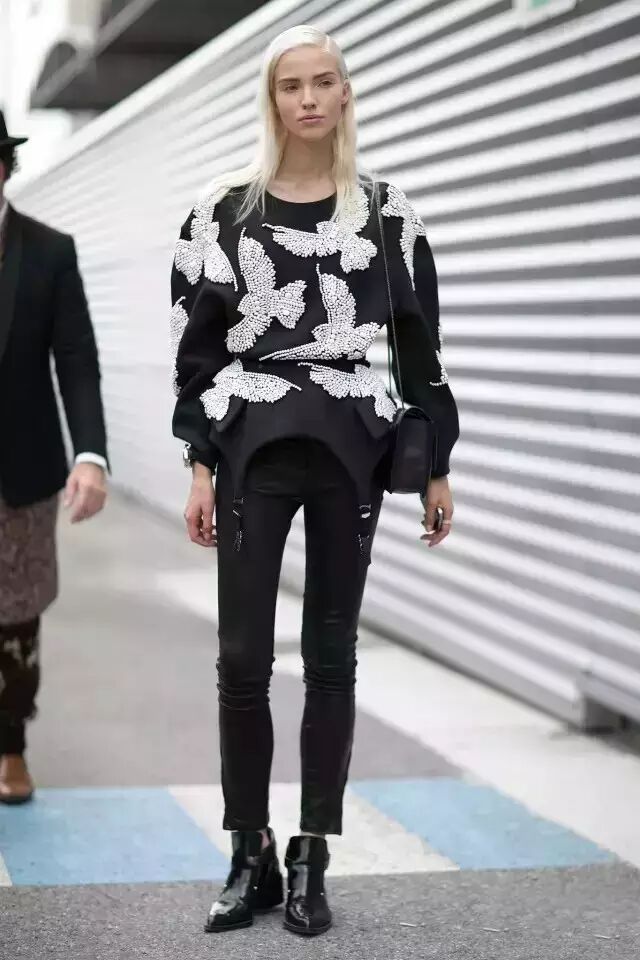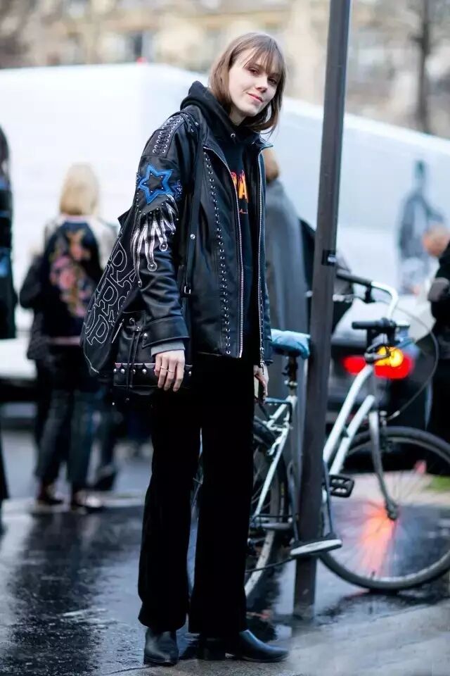 利落率性的all black,黑色卫衣和机车短靴的完美结合让整体惹眼度瞬间提升,同样帅气的皮裤突出整体造型的摩登感。