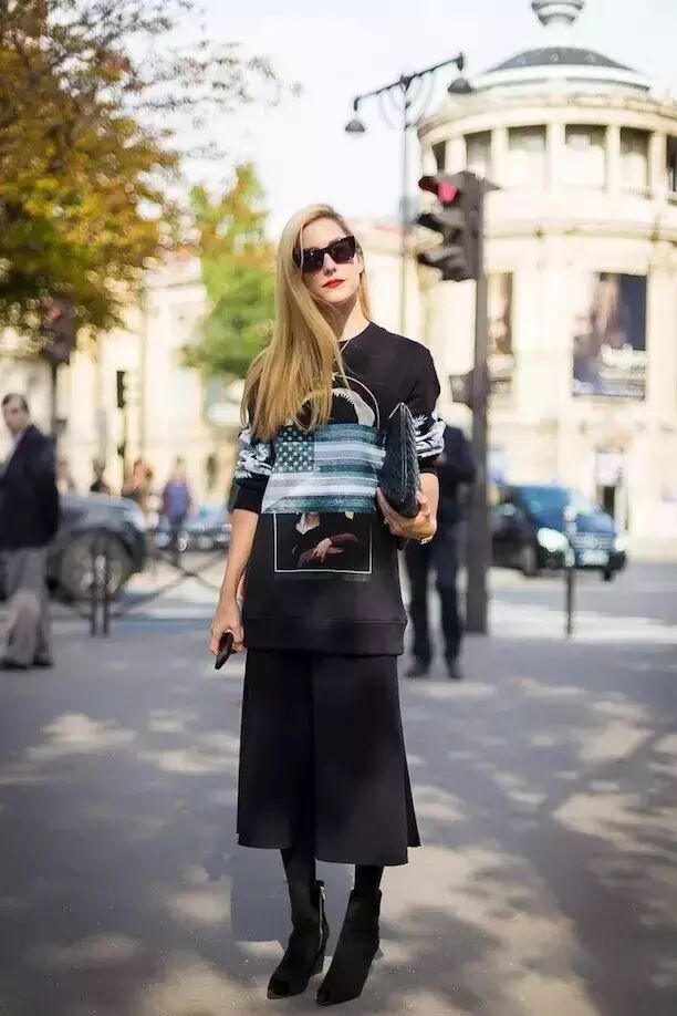 而搭配阔腿裤,可以说是中长半裙的改良版,运动风的卫衣整体给人活泼的感觉,加入了阔腿裤也是可以作为日常的办公室造型。